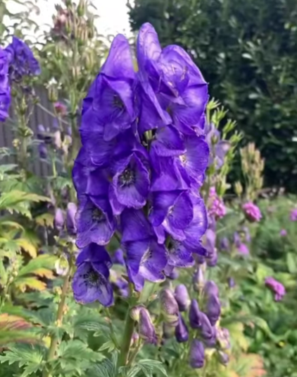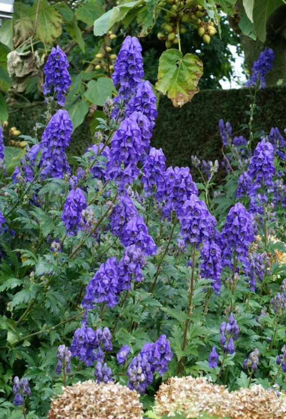 Dramatic tall stalks of blue-violet flowers in summer- fall create architectural interest. Grows best in moist soils in part shade. All parts are poisonous. Attracts pollinators. Excellent deer resistance. Perennial. Zone 4-7. Pairs well with woodland denizens like ferns, hostas and hydrangeas