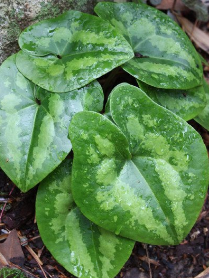 Stunning evergreen clump of large, glossy, heart-shaped leaves with silvery-green markings. Called Panda Face Ginger as a nod to the unique velvet, black flowers with a white interior, that resemble a Panda Face. They appear under the foliage in spring. Full to partial shade. Ht. 6in, Space every 12” for a lovely deer resistant groundcover. Zone 7-9 Pant in rich soil with regular water for best performance.