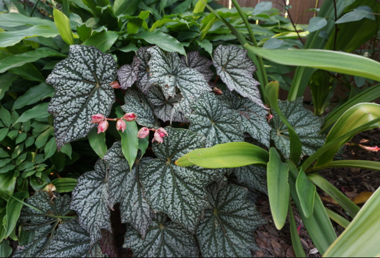 This new hardy Begonia introduction bred by,’ Ozzie Johnson’ is truly lust worthy! Ginormous dark green palmate leaves have a thick overlay of silver, mint green and heavy veining with tints of pink. This beauty will illuminate a shady garden or container and set your heart a flutter! Sprays of delicate flowers in hues of pink, red and salmon rise above the foliage on strong stems and continue their performance until frost. Deer resistant. Happiest in well drained loamy soil in part sun- dappled shade with reasonable water. More sun tolerant than others. Deciduous and dormant in winter. As with all hardy begonias, ‘Sterling Moon’, is a bit late to emerge in spring, so try underplanting with spring ephemerals like snowdrops. Perennial Hardy down to zone 7a. 24-30″ tall by 24-20″ wide.