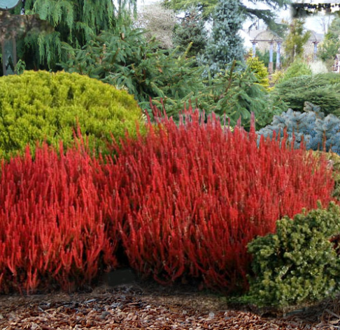 A color changing wonder through the seasons! Welcomes spring with bright chartreuse and yellow foliage and dark lavender flowers late-summer. The foliage slowly transitions to orange and red until it takes on a spectacular brick red color to carry the show through winter. The foliage remains evergreen and makes a tidy mound. Shear tops in spring to keep from getting scraggly. 1-2’ tall and wide, but expect wider over time. Moist well- drained soil in sun-part sun. Appreciates some shade from hot afternoon sun in warmer climates, but still needs ample sun to show off the amazing colors. Deer resistant. Award of Garden Merit from the RHS for it’s wonderful garden presence! In a crowded field , it’s one of the best! Zones 4-6
