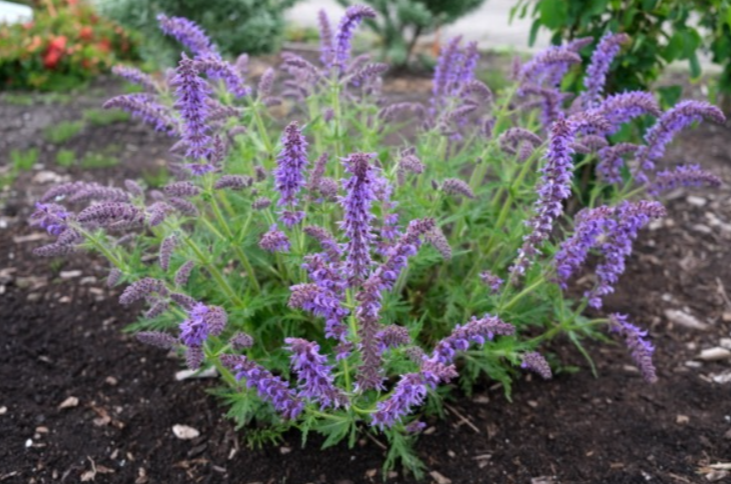 Deeply serrated basal leaves offer a unique textural twist. An interesting combo created by crossing salvia nemorosa to the cutleaf salvia jurisicii. Forming a tight clump 16” high x 20” wide with big spikes of blue-purple emerging in a fountain form. Salvia,’ Feathers’ enjoys a long bloom-time from June-August and with deadheading will rebloom in fall. Well-drained soil in sun-pt shade with some supplemental water. Deer resistant, perennial.  Zones 4-9