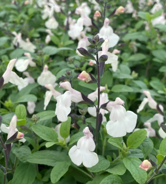 Very floriferous with a flurry of creamy-white flowers spring into fall held on black stems with dusky black calyxes. A wonderful color break and a must-have for a moon-garden. Happy in full sun to part shade in well-drained, fertile soil. Leave the foliage in winter and cut back hard in spring for new bushy growth. Highly deer resistant. Ht 2’ x 2’ Perennial Zones 7-10